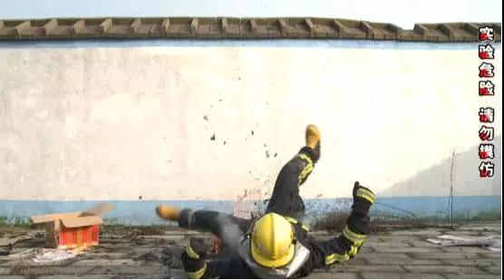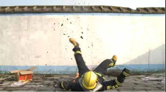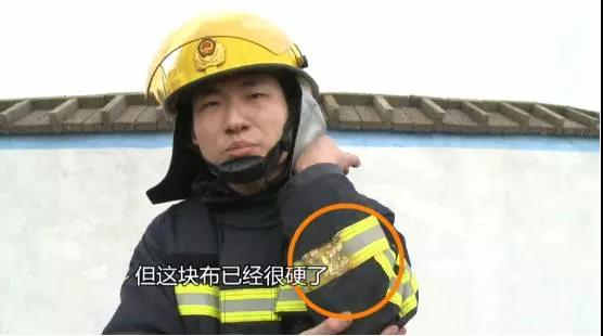 半蹲在火堆里十秒左右,消防服上的反光條燒壞了,不過大史依然沒有被燙到。