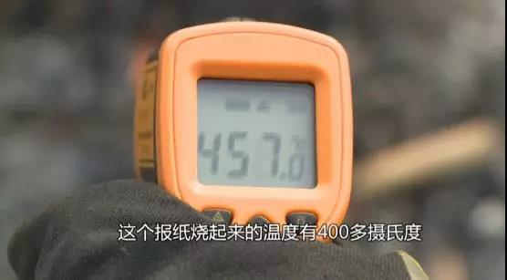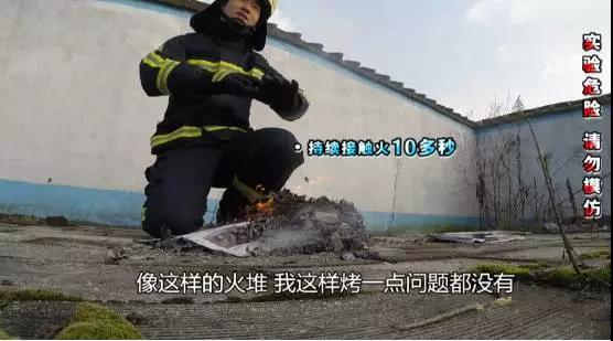 點燃報紙,燃燒的溫度是500度左右,大史穿著消防服,直接把手伸進火里,感覺是很暖和,還挺舒服,手離開火堆馬上降溫。
